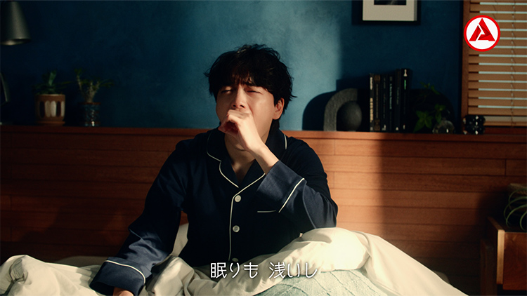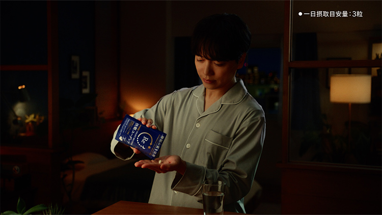 朝、すっきり起きられず、眠そうな様子の山崎さん。夜にパチスロ ルールナイトリカバー 快眠ユーグレナを手に取り、3粒のみます。気持ちよさそうに眠り、朝からさわやかにベランダで水やりをする様子を描いています。
