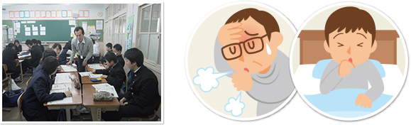 - 具体的な症状例(タケル君とお父さん)などから考える身近な事例や実物教材は、生徒にとってイメージしやすく、また、クイズ(質問)形式のスライドもあり、いつも以上に集中して学習をしていました。