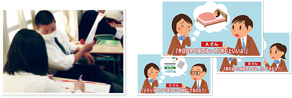 ・「かぜをひいたように体調が悪いときにどうする?」と投げかけ、生徒自身から「ドラッグストアで漢方薬を買った」などの体験を挙げさせる。 その上で、「一般用医薬品」と「医療用医薬品」の違いを確認。