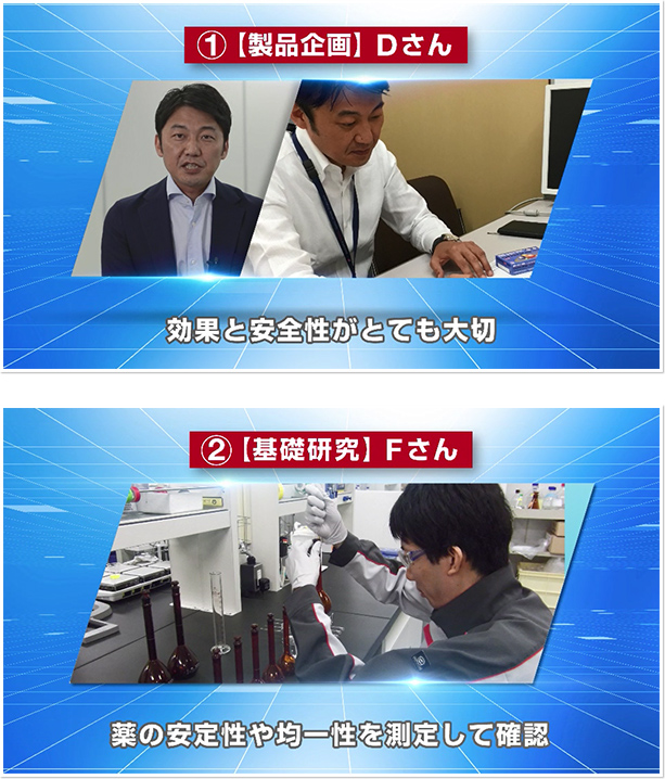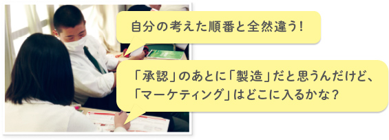 ・社員のインタビュー映像から製薬会社の「仕事」に関する情報を読み取り、正しい開発・承認過程のプロセスを考える。映像をみて、個人で考え、友達と共有するアクティブ・ラーニング手法!