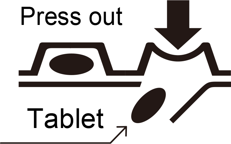 As shown in the figure, press the protruded portion of the PTP sheet with your finger to tear the aluminum foil and take out a tablet. (If you swallow the PTP sheet by mistake, its sharp edges may perforate your esophagus, etc., resulting in serious complications.)