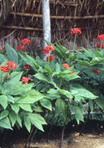 草丈60cmほどの多年草です。葉は長い柄をもち、4~5月に淡黄緑色の小さな花が咲きます。果実は7月下旬頃に熟し、鮮やかな紅色になります。細根や皮を除いて乾燥した根を「白参」、蒸して乾燥した根を「紅参」といい、調製法によって大別されています。生薬としては、ウコギ科チョウセンニンジンの根を乾燥したものを用います。ちなみに、このニンジンは通常1年間の苗作りの後、5年間栽培して収穫します。