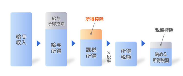 所得税を計算する際、納税者それぞれの事情を考慮し、所得金額から差し引くことができる控除です。所得税は課税所得の金額に対してかかるので、所得から控除できる金額が大きいと、税金が安くなります。