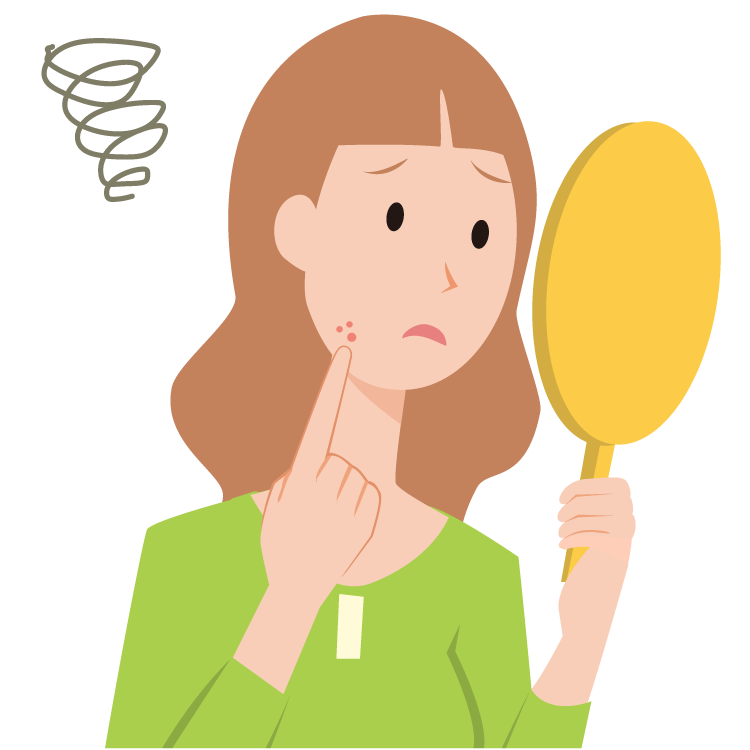 生理の一週間ほど前になると、黄体(おうたい)ホルモンの分泌が盛んになり、皮脂の量が多くなります。生理前ににきび・吹き出ものができ易くなるのはそのためです。