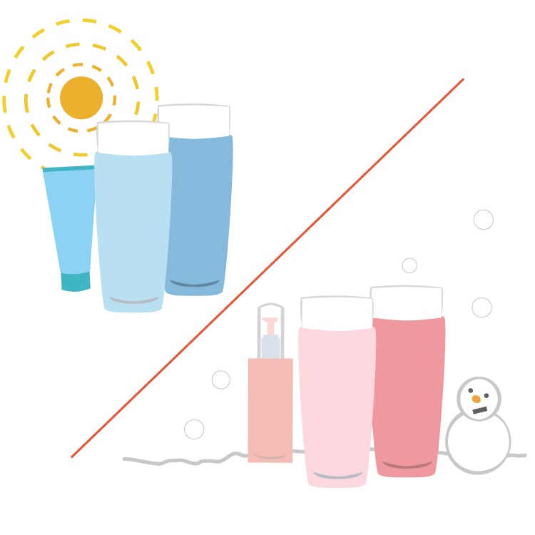 湿度の高い夏と乾燥した冬とでは、当然、お手入れのしかたも変わってきます。皮脂が多くなる夏場は、化粧水はさっぱり系に、逆に乾燥しがちな冬場は、しっとり系の乳液やクリームというように、モイスチャー用品をうまく使いわけましょう。