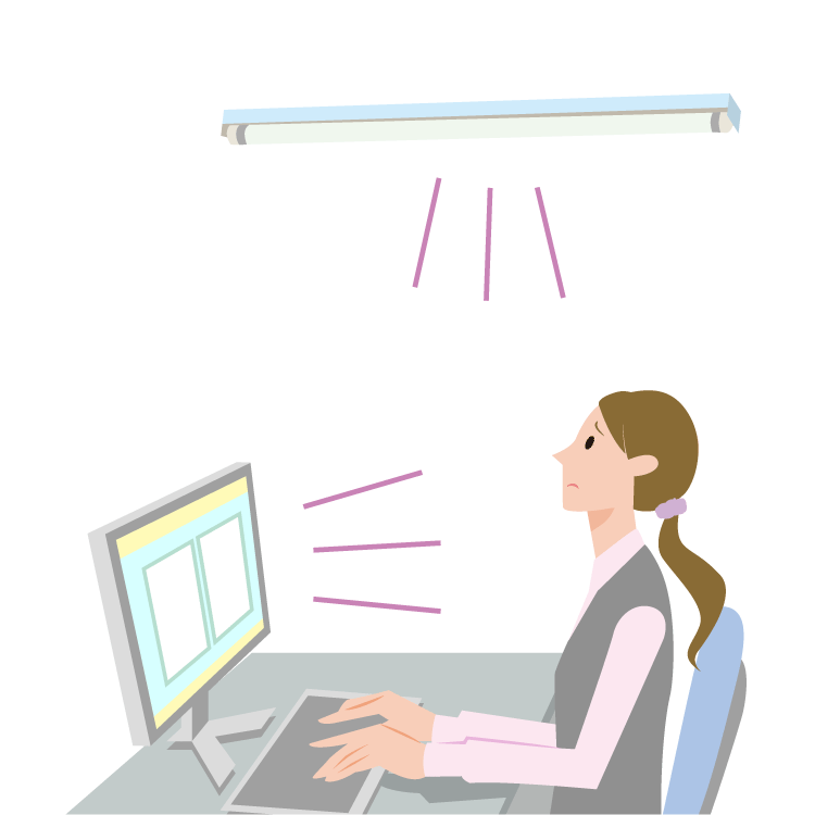パソコンなどの液晶画面や蛍光灯の光も、太陽光線ほどではないにしてもUV-Aの波長を発しています。長時間浴びていると、この波長から肌を守ろうとしてメラニンがつくり出されて、肌がくすみ、日焼けに似た症状が起こります。ビタミンCの入ったホワイトニング化粧品などでケアすると良いでしょう。