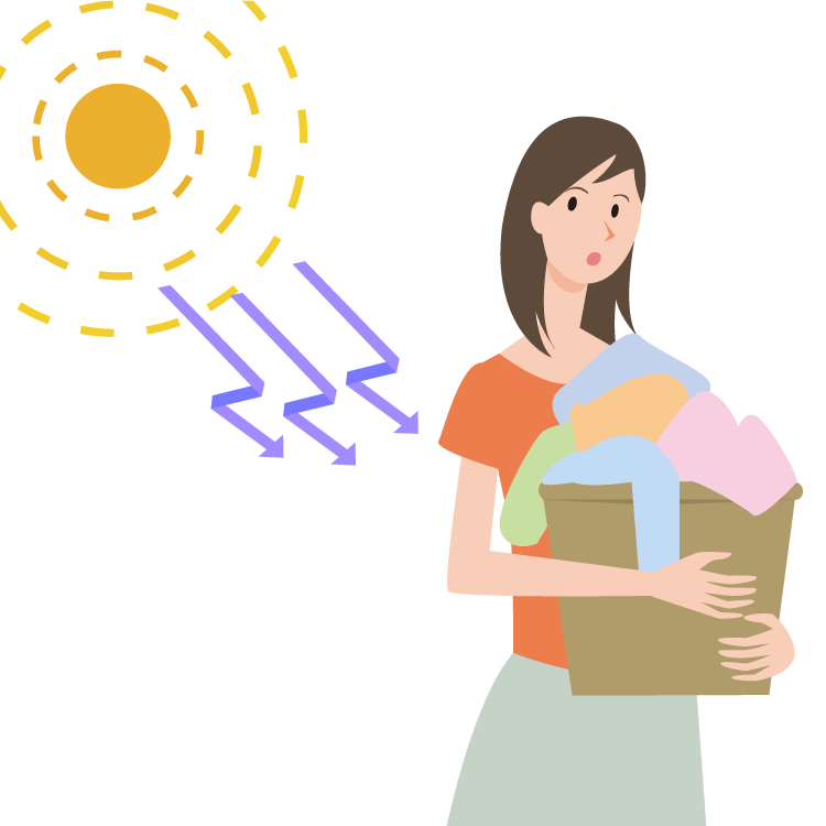 しみ・そばかすだけでなく、肌の老化やしわの原因にもなる紫外線。日傘や帽子はもちろん、日焼けどめクリームや紫外線をカットする効果のあるパウダーファンデーションなどの化粧品も上手に使うと良いでしょう。とくに午前10時から午後2時にかけては、紫外線が最も強い時間帯なので、外出時だけでなく、ベランダで洗濯物を干すときなどのわずかな時間でも十分な注意が必要です。