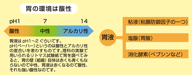 強い酸で胃の組織が傷つけられないのは、胃壁を覆う胃粘膜の表面から出る粘液によって、胃が溶けないよう守られているからです。また、粘液の中には胃酸を中和する物質などがあり、それらによって酸が中和されているのです。