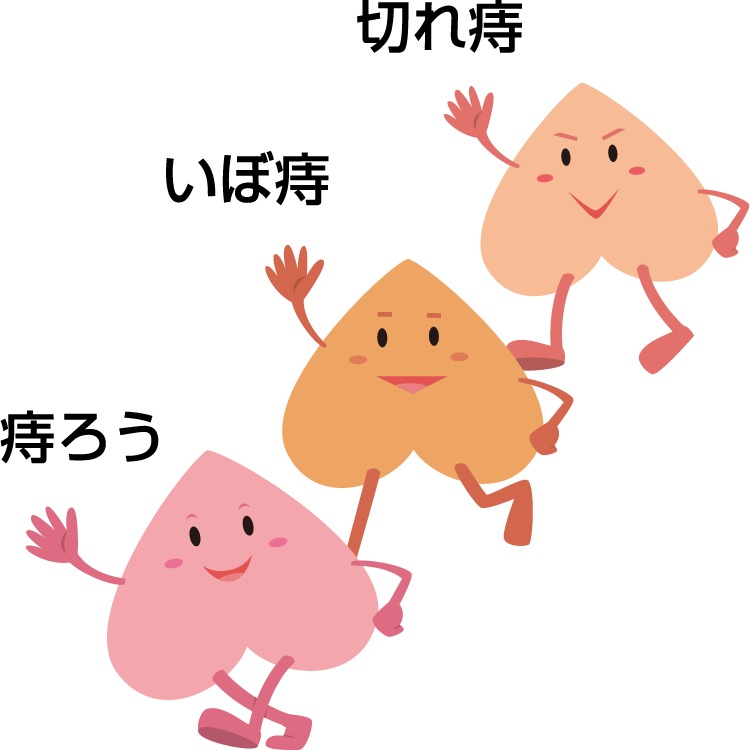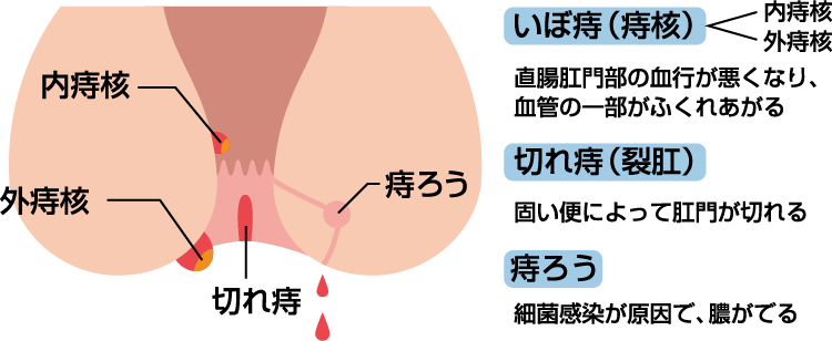 皮膚には、痛みを感じる神経がたくさんあります。ですから肛門側にできる切れ痔や外痔核は痛みをともなうのです。また、いぼ痔は突然、大量の出血がありますが、切れ痔は出血は少なく、拭(ふ)いた紙に付着する程度です。痔ろうの場合は膿が出て下着が汚れることがあります。