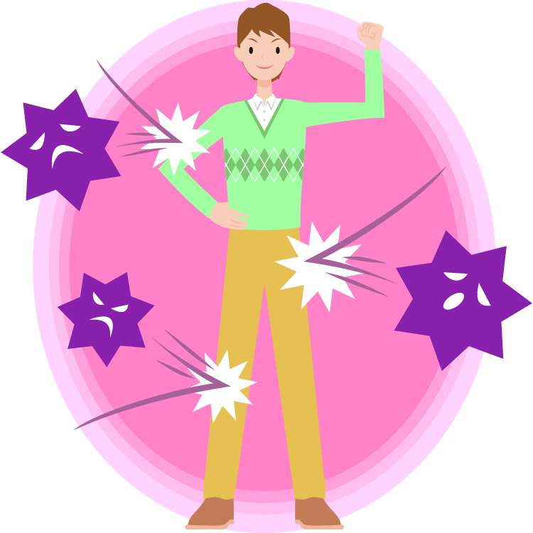 そこで、まずウイルスは乾いた鼻やのどの粘膜に忍び込み、細胞の乗っ取りをくわだてます。そして、いったん乗っ取りに成功すると、後はその細胞の働きを使って、次から次へと分裂し、自分のクローン(分身)を量産していくのです。しかし、どんなにクローンを量産したところで、体が乗っ取られることはありません。攻められる方の体にも、外敵をやっつける「免疫」という防衛隊がついており、安静と栄養という援護体制をとってあげれば、免疫はがぜん強さを増し、ウイルスを返り討ちにしてくれるのです。
