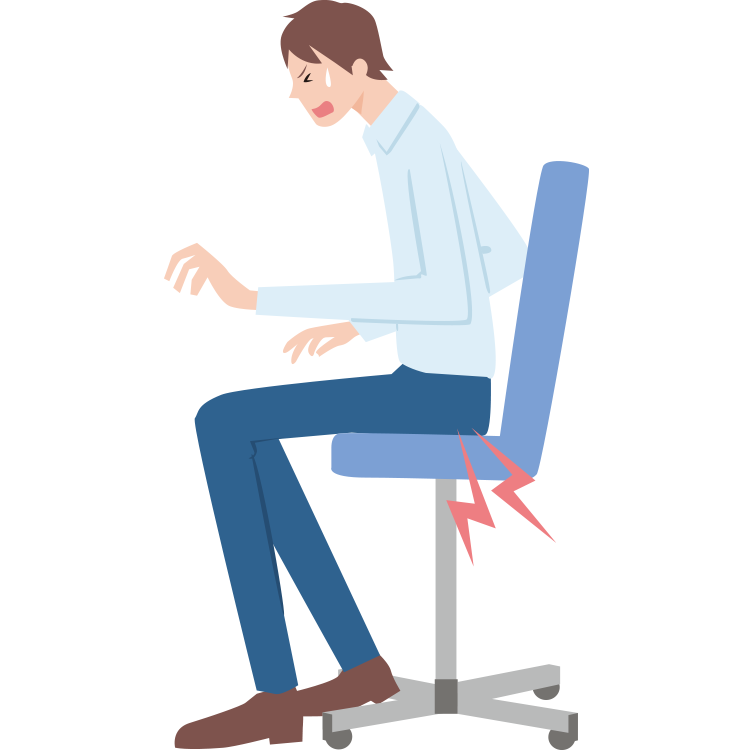痔の予防には同じ姿勢を長時間続けないことが大事です。座りっぱなし、立ちっぱなしのときは、少しでも休憩タイムを作って体を伸ばしたり、肩を上下、足の屈伸などを心がけましょう。座ったまま動けないようなときは、ちょっと腰を浮かせてみるだけでも、お尻にかかる体重から解放され血行が戻ります。