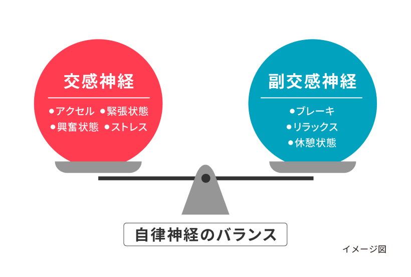 ストレスがかかったときには、交感神経が興奮します。現代社会では慢性的なストレスにさらされやすいため、交感神経が優位な状況が続いてしまうことになりがちです。