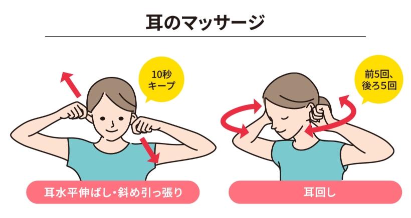 <耳のマッサージ>手のひらで耳を温めながら以下のマッサージをしてみましょう。