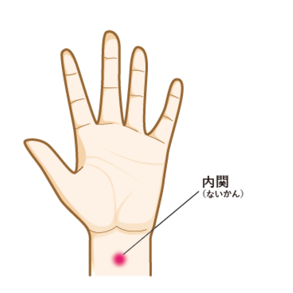 手のひら側の手首のしわから指の幅3本分ほど肘寄りの「内関(ないかん)」、