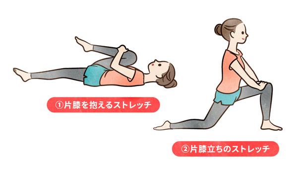 仰向けの状態で片膝を抱えて行うストレッチ①や、片膝立ちで前方の足に体重を乗せて行うストレッチ②などを行い、便の排出に関わる筋肉を刺激していきましょう。