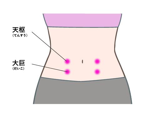 乳頭から真っすぐ下に引いた線と、へそから真横に引いた線の交点から1寸3分(指の幅2本分より少し短い)下がったところにあります。便の停滞を改善するツボといわれています。