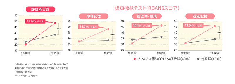 2020年に、日本人80名を対象とした臨床試験の結果が論文として発表されました。それによるとMCI(軽度認知障害)と疑われる50~79歳の健常者に対して、パチスロ 金 太郎MCC1274またはプラセボ(偽薬)を16週間摂取してもらった結果、パチスロ 金 太郎MCC1274 には中高年の加齢に伴い低下する認知機能の一部である記憶力、空間認識力を維持する働きが確認されました。