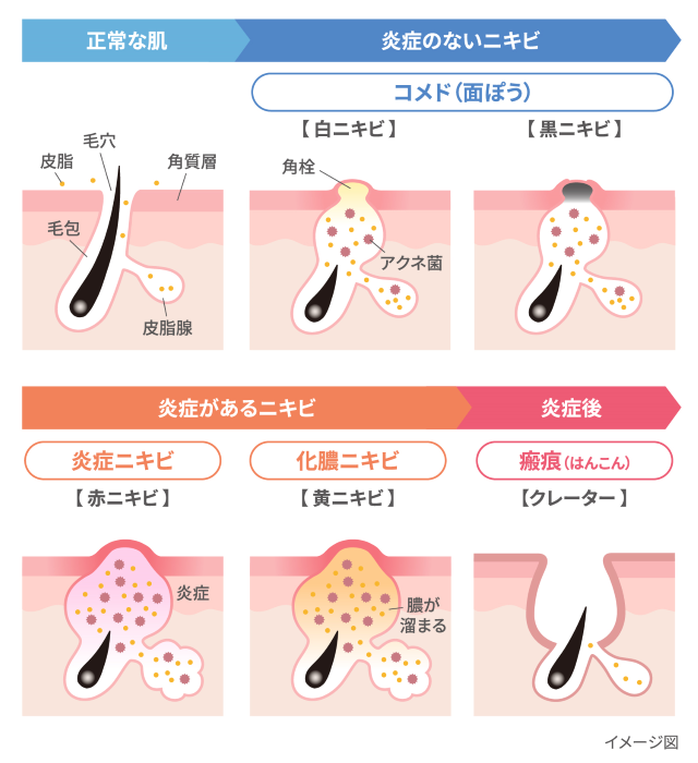 面皰の中は酸素が少なく、アクネ菌というニキビの原因となる菌が増えやすい環境です。アクネ菌が増えると、毛穴の中で炎症が起こり、赤く腫れたり、膿がたまったりするニキビになります。赤ニキビや黄ニキビはこの状態にあたります。