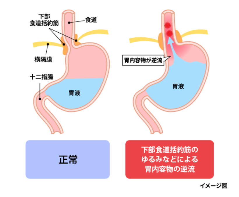 たとえ胃酸や胃の内容物が一時的に逆流しても、食道のぜん動運動がきちんと働けば逆流したものは胃に戻され、食道への悪影響は抑えられます。しかし、ぜん動運動がしっかり働かないと、逆流してきたものが長時間、食道内に留まることになって、食道粘膜のダメージが大きくなってしまいます。