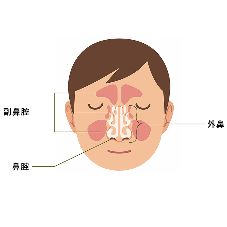 鼻の構造は骨や軟骨によって形作られており、大きく分けて、顔面の突出したピラミッド型の「外鼻(がいび)」、外鼻に空いた鼻の穴(外鼻孔)から奥に広がる粘膜に覆われた空間「鼻腔(びくう)」、そして鼻腔を囲む骨の内側にある小さな空洞の「副鼻腔」の3つで構成されています。副鼻腔は左右1対の8つの空洞から成り、奥で脳や目に隣接しているとともに、鼻の穴(鼻腔)と一部でつながっています。