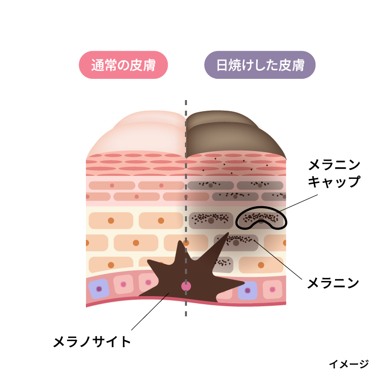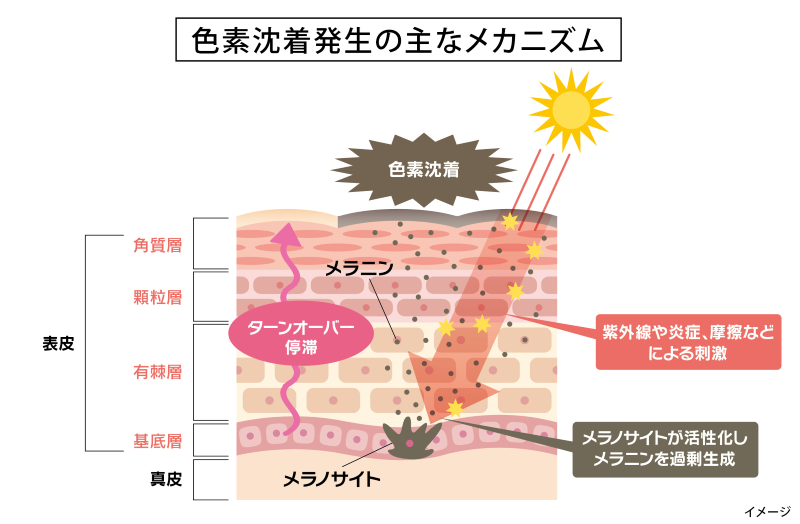 通常、生成されたメラニンは、皮膚の「ターンオーバー(新陳代謝)」によって徐々に皮膚の表面へと押し上げられ、最終的には古い角質と一緒に垢となって自然に排出されます。しかし、以下のような理由でこのサイクルが乱れると、メラニンが皮膚内部(表皮、あるいは真皮)に残ってしまいます。