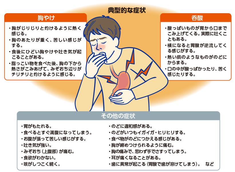 北方先生: 本来はしっかりと締まっているはずのつなぎ目がゆるんでしまうと、胃の中にある食べ物の一部や胃液が食道に逆流してしまうことがあります。ところが、食道の粘膜は、胃液に含まれる強い酸(胃酸)に耐える力がありません。そのため、逆流が繰り返されることで粘膜に炎症が生じ、胸やけなどの不快な症状につながってしまうのです。これが「GERD」という病気です。代表的な症状としては、「胸やけ」や「酸っぱいものがのどまで上がってくる感じ(呑酸)」、「逆流感」などがよく知られています。