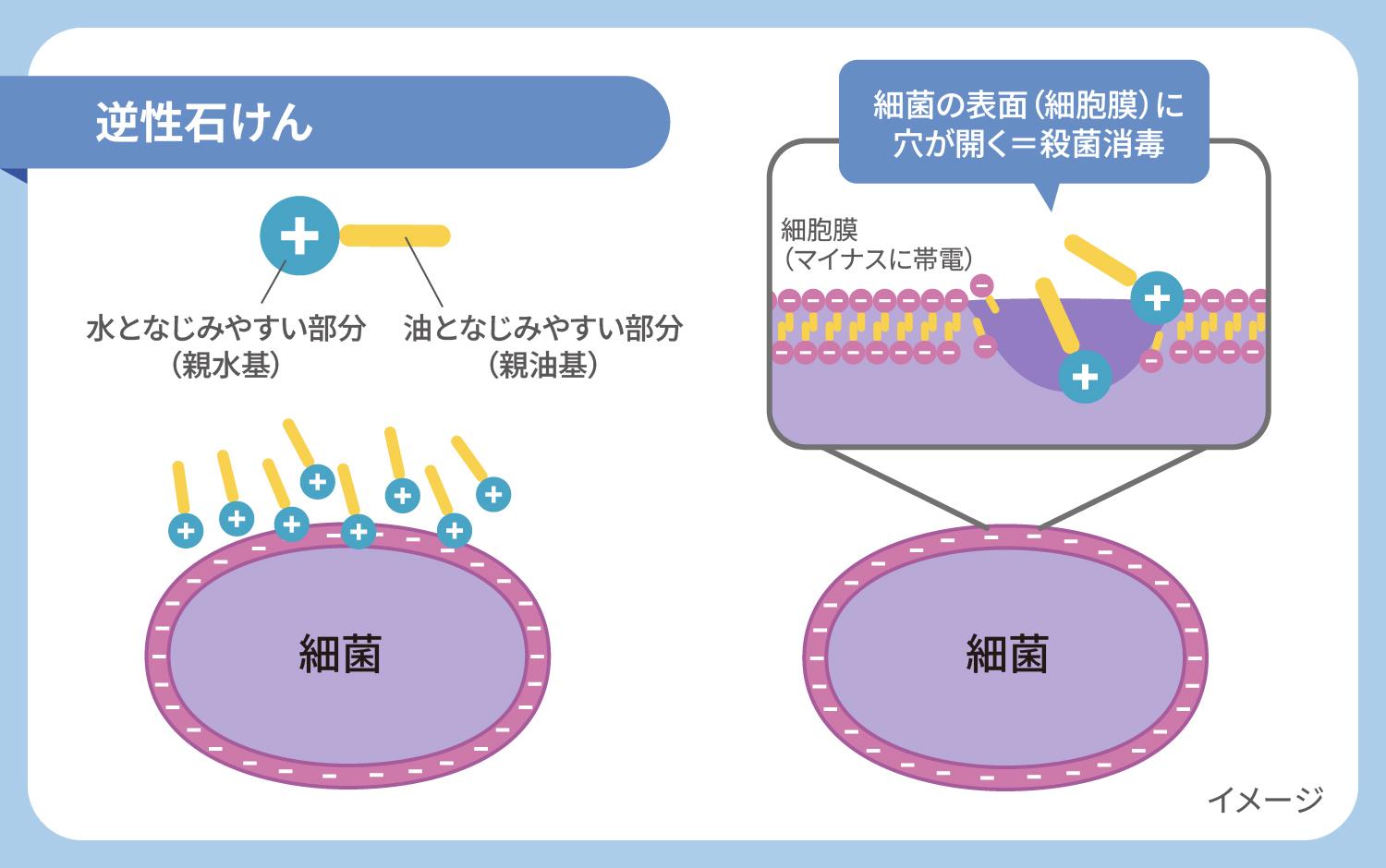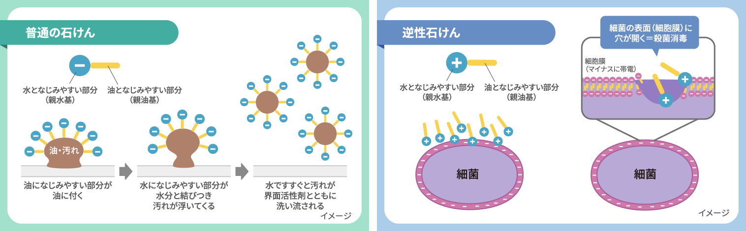 | 特徴 | 泡立ちが良く、皮脂などを分解する作用があって洗浄に適しているが、殺菌消毒作用は弱い | 殺菌消毒作用は強いが、洗浄効果は高くない |