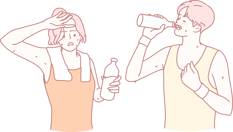 夏に運動をする際は、熱中症、脱水に十分注意するようにしてください。こまめに水分・塩分を補給し、帽子をかぶって、通気性の良い服装で行うようにしましょう。
