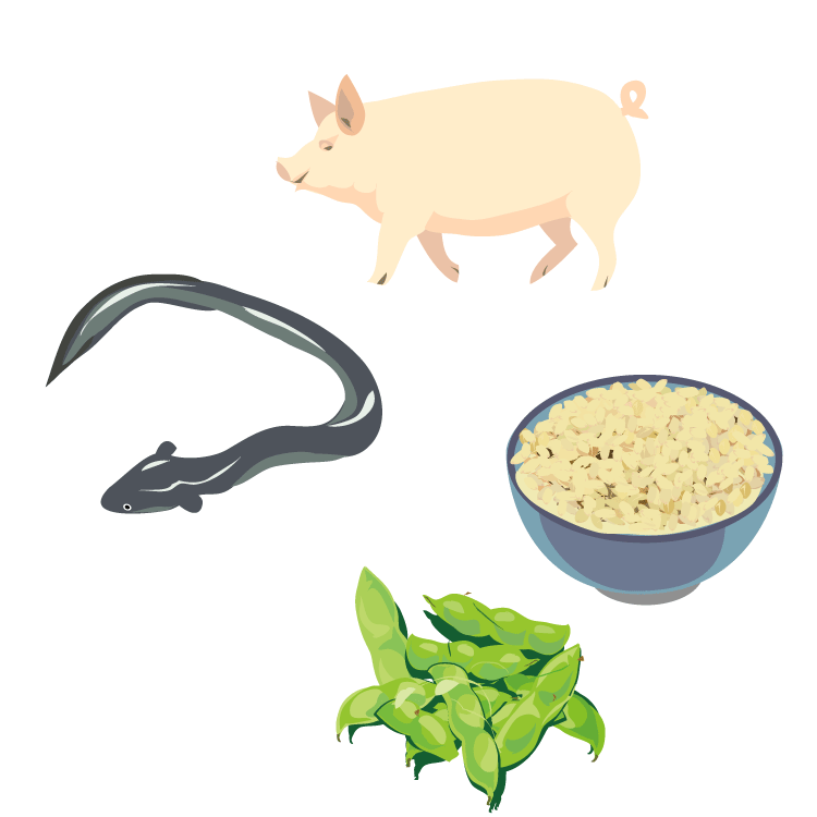 ビタミンB₁ 玄米、豚肉、うなぎ、枝豆 など
