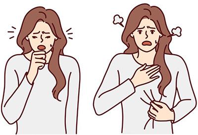 食道に逆流してきた物の一部はのどにまで到達して、気道(肺へ続く空気の通り道)に入り込むこともあります。そのために、風邪をひいたわけではないのに、のどが痛くなったり違和感が現れたり、声がかれたりせきが出たりすることがあります。
