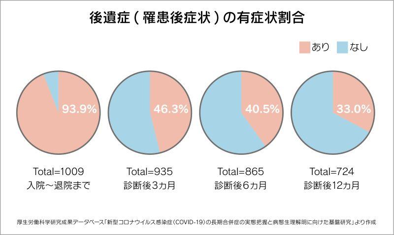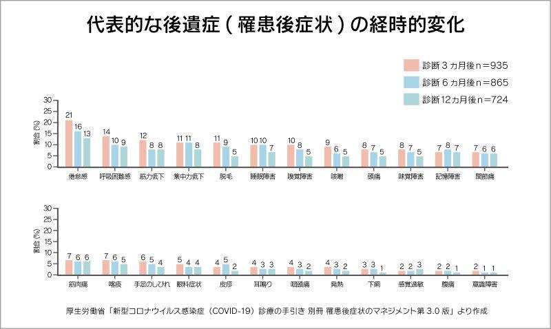 なかでも、呼吸器症状や嗅覚・味覚障害については、感染初期によくみられ、症状に対する治療を行うことで回復することが知られています。精神・神経症状や痛みは感染後数ヵ月経っても後遺症として残ってしまいます。