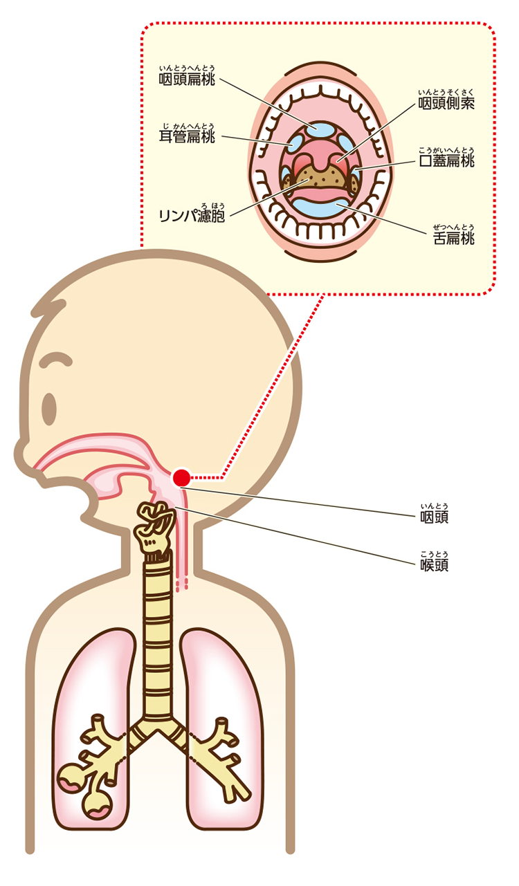 扁桃は喉の周囲を取り巻く組織で、通過する食べ物や外気に監視の目を光らせています。4種類ありますが、口を大きく開けたときに突き当たりの左右に見える口蓋扁(こうがいへん)桃(とう)を一般に扁桃と呼びます。扁桃はリンパ組織の集まりで、外部から侵入したチリやホコリなどの異物、ウイルスや細菌などの病原体を排除し、体を守る関門の役割をしています。