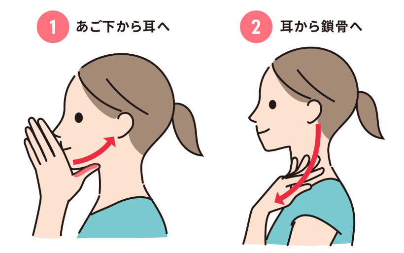 1.あごの下から耳へ:あごの下に指をあてて、あごのラインに沿って耳に向かって上方向へ、やさしくなでます。