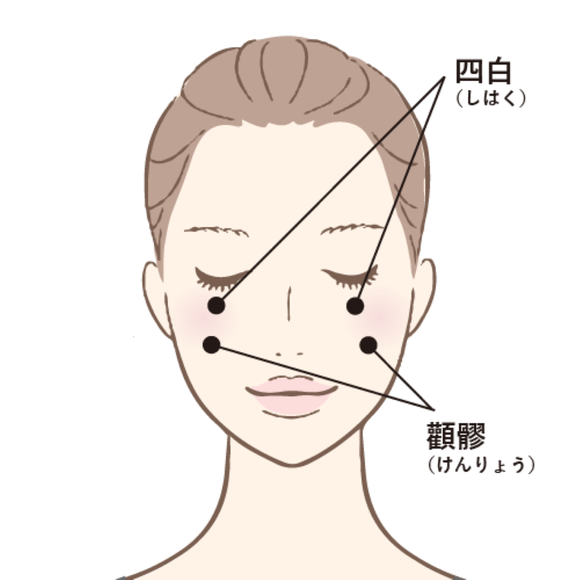 ・四白(しはく)瞳(黒目)の真下かつ、目のふちから指の幅1本分下がった場所にあります。人差し指の指先で、やや上に押し上げるように刺激すると良いでしょう。 ・顴髎(けんりょう)頬骨の最も隆起した部分を、中指の先で下から押し上げるように刺激しましょう。
