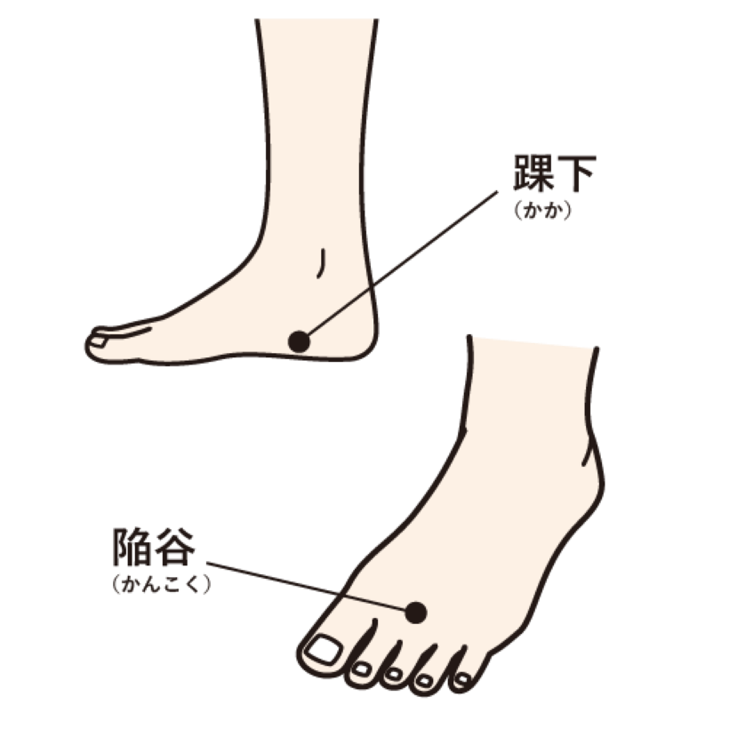 ・陥谷(かんこく)足の人差し指と中指の間で、指の股から指幅2本分のところにあります。親指を用いてまっすぐ下(皮膚に対して垂直になるように)に押すと良いでしょう。左右ともに刺激しましょう。