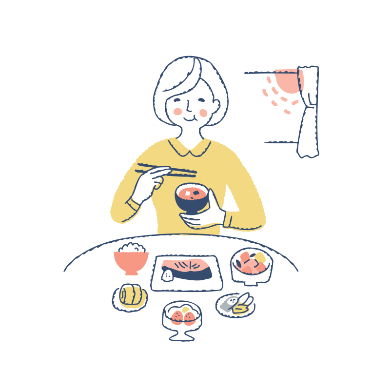 特定の栄養素に偏ることなく、主食・主菜・副菜をそろえ、タンパク質、ビタミン、ミネラルといった体に必要な栄養素をバランス良く摂取することが大切です。栄養バランスの整った食事は、血行不良等が原因で起こるむくみの予防にもつながります。