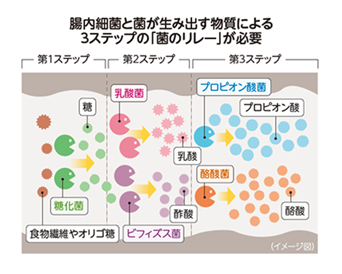 〈第1ステップ〉……糖化菌や納豆菌(炭水化物分解菌の総称)が食物繊維やでんぷんを分解し、糖を生成する 〈第2ステップ〉……糖を、乳酸菌やビフィズス菌、日本人の腸に多いブラウティア菌などが分解し、乳酸や酢酸を生成する 〈第3ステップ〉……乳酸や酢酸を、酪酸菌やプロピオン酸菌などが分解し、プロピオン酸や酪酸を生成する