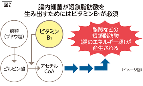 ブドウ糖などはさまざまな代謝のステップを経て、ピルビン酸という化合物に変わる。 ピルビン酸が、エネルギー代謝や物質代謝のプロセスで不可欠な化合物であるアセチルCoAという化合物に変換されるときに必要なのがビタミンB1である。アセチルCoAは様々な経路を経て、酪酸などの短鎖脂肪酸(腸のエネルギー源)を産生する。