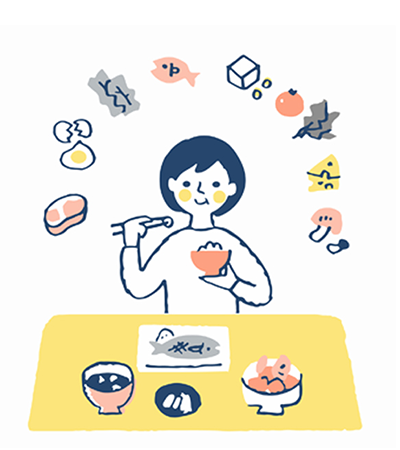 一方、質の良い睡眠に関与する栄養素として、グリシンやトリプトファンなどが挙げられます。グリシンはアミノ酸(タンパク質を構成している成分)の一種で、食品としてはカジキマグロ、ホタテ、エビなどに多く含まれています。トリプトファンは、精神を安定させる働きがある「セロトニン」の合成に必要な必須アミノ酸(体内で合成できないため食品からの摂取が欠かせないアミノ酸)です。食品としては、魚介類や鶏肉、卵、大豆製品、ゴマなどに多く含まれています。また、セロトニンだけでなくメラトニンの合成や代謝にも関わるビタミンB6、マグネシウム、ナイアシン(ニコチン酸アミドとニコチン酸の総称)なども意識して摂取するようにしましょう。