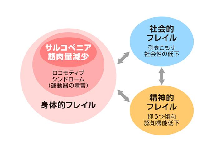 また、図からわかる通り、フレイルは「身体的フレイル」「精神的フレイル」「社会的フレイル」の要素からなります。