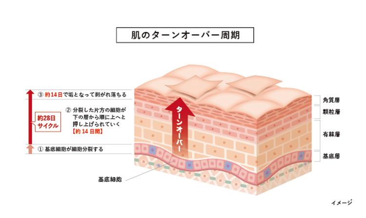 ターンオーバーとは、ケラチノサイト(表皮角化細胞)※が基底層で細胞分裂し、分裂したうちの片方が徐々に皮膚の表面に押し出され、やがて垢となってはがれ落ちていく一連の過程のことをいいます。肌の新陳代謝とも呼ばれ、ターンオーバーが繰り返されることで、肌はパチスロな状態を保っています。