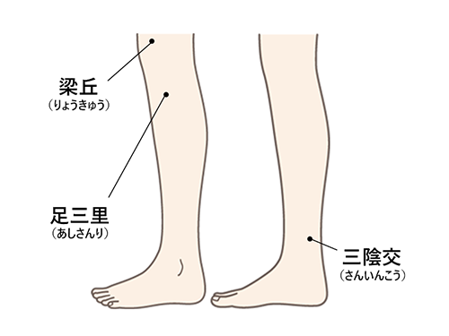 膝のお皿の外側の上端から、太ももに向かって指の幅3本分ほど上のところにあります。梁丘は胃腸の働きを整え、三陰交と同様に空腹時の胃の痛みに効果的といわれています。