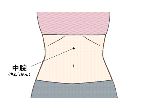 みぞおちとへその中間にあるツボです。仰向けになり、中指を中脘に当て、人差し指・中指・薬指の3本でお腹の中心に向かって押すのがおすすめです。中脘には、胃の痛みを鎮める効果が期待できます。