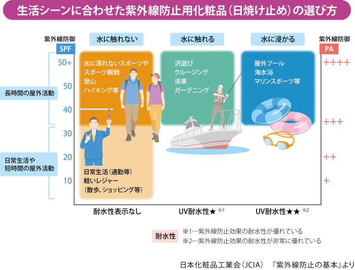 日焼け止めの効果は SPF(Sun Protection Factor)と PA(Protection grade of UV-A)で表示されています。SPFは主にUV-Bを防ぐ指標、PAは主にUV-Aを防ぐ指標です。SPFは数値であらわされ、その数値が大きいほど、UV-Bを防ぐ効果が高く、PAは「PA+」〜「PA++++」の4段階であらわされ、「+」の数が多いほどUV-Aを防ぐ効果が高くなります。
