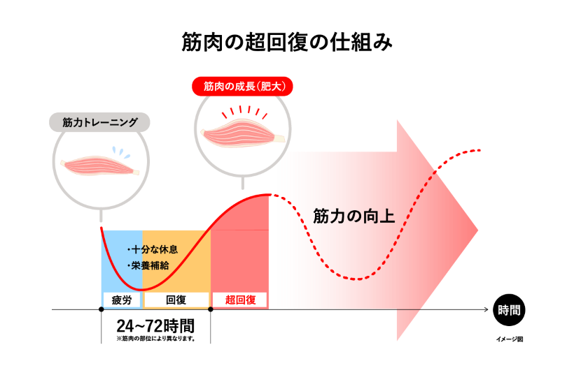 タンパク質の合成速度はトレーニング後、1~2時間の間、亢進するとされており、筋肉量を増やすためには、この時間帯を意識してタンパク質を摂取するのが最も効果的と考えられています。