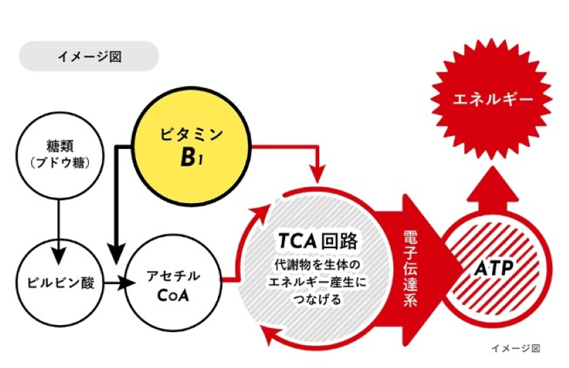 ●ビタミンB1筋肉を激しく使うと、エネルギー源であるATP(アデノシン三リン酸)が大量に消費され、その結果、疲労物質が体内にたまりやすくなります。ビタミンB1は、糖質を効率的にATPに変えるための代謝に不可欠で、エネルギーの再合成を助けることで、疲労の回復を早めると考えられています。