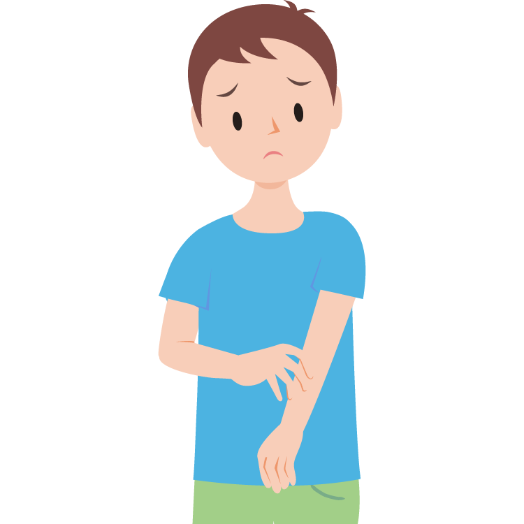 ケムシは背中の毒針で刺します。一度に数か所を刺す上、針が服を通り抜けて露出していない部分も刺されることがあります。ケムシの中でもツバキやサザンカなどにつくチャドクガのケムシによる被害が一番多いといわれています。小さな赤い発疹ができて、ピリピリとした痛みが生じた後、強いかゆみが出ます。これらの症状にもアレルギー反応が関係しています。