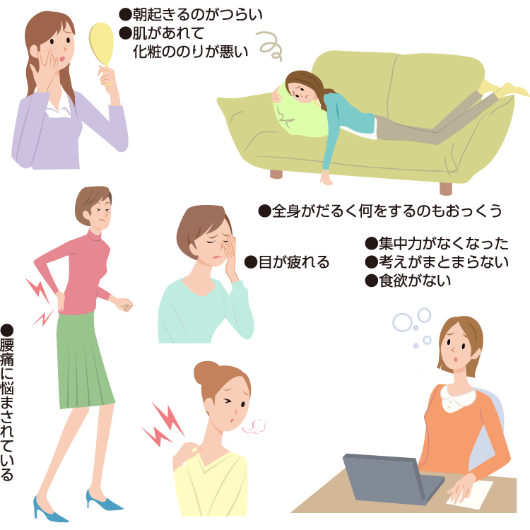 疲れは、体のいろいろなところに症状となってあらわれます。ここに挙げたのはほんの一例。