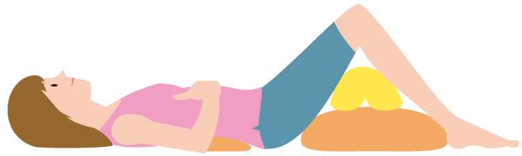ひざを立てて、あおむけに寝ます。つぎに両手をほほに付けて、鼻からゆっくり、思いきり息を吸いこみ、口からゆっくり息を吐きます。これを4~5回くり返します。