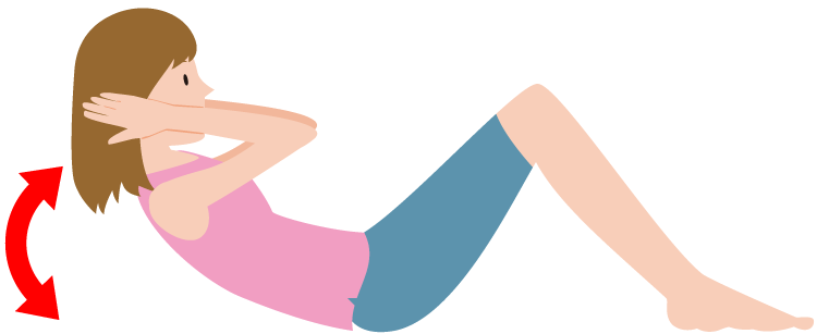 腹式呼吸の姿勢から5秒くらいかけて、ゆっくりと上体を起こします。肩が床から25cm程度上ったところで約5秒間、この姿勢を保ち、また5秒ほどかけて、頭を床にもどします。